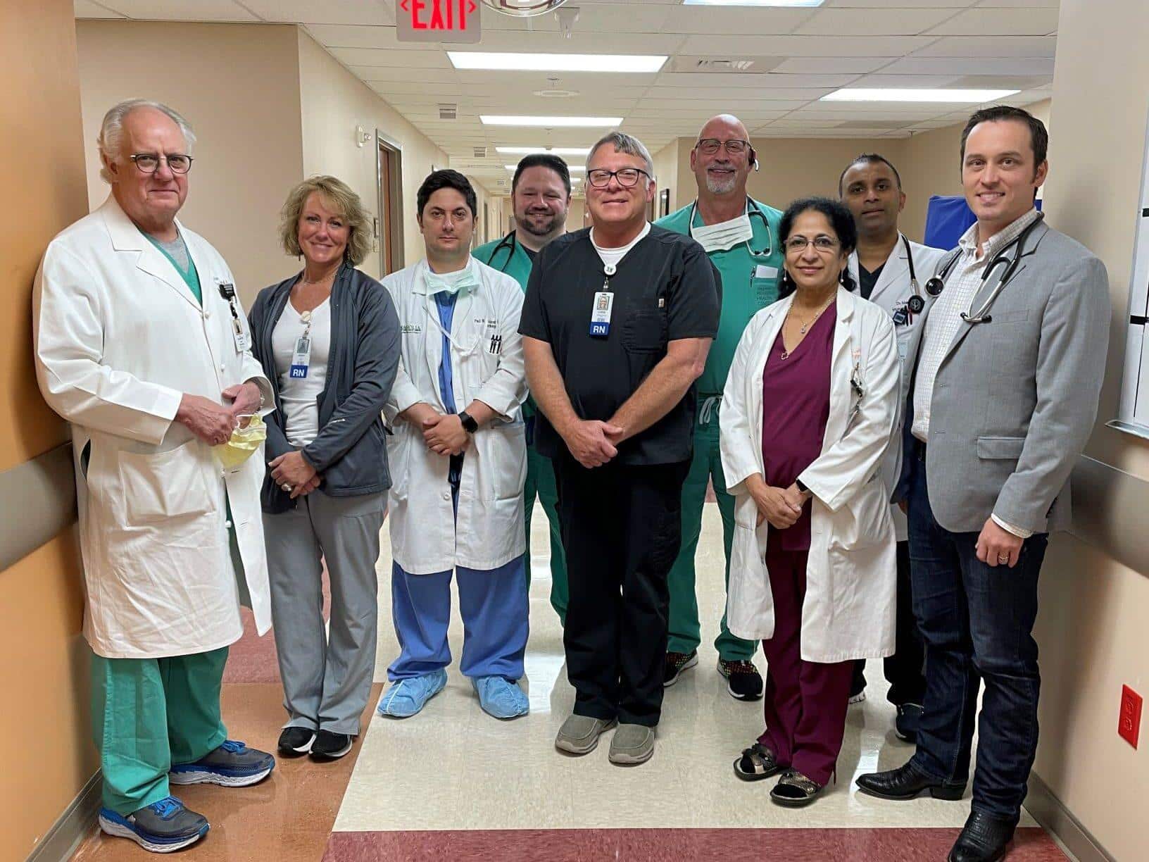Pictured (L to R): Dr. James Gilmore, Cardiovascular and Thoracic Surgeon/Chief Medical Officer; Jenny Miller, Chest Pain Center Coordinator; Dr. Paul Volansky, Interventional Cardiologist; Dr. Aaron Earles, Interventional Cardiologist; Chris Harville, RN Outcomes Manager; Dr. Kerry Morgan, Cardiologist; Dr. Nanni Pidikiti, Cardiologist; Dr. Mandar Jagtap, Interventional Cardiologist; Dr. Nathan Smith, Cardiovascular and Thoracic Surgeon